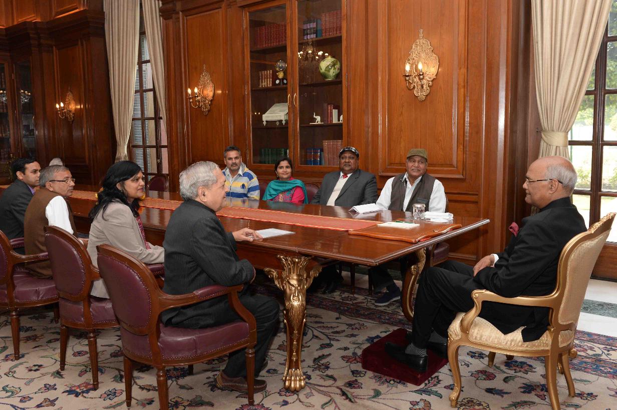 | Caption: | Shri M.L. Dipak, President Veerangana Jhalkar Bai Seva Sansthan, Ghaziabad along with Shri Ghanshyam Singh, Retd. DCM (Railways) and others meeting with the President of India, Shri Ram Nath Kovind, at Rashtrapati Bhavan on January 17, 2018. |
