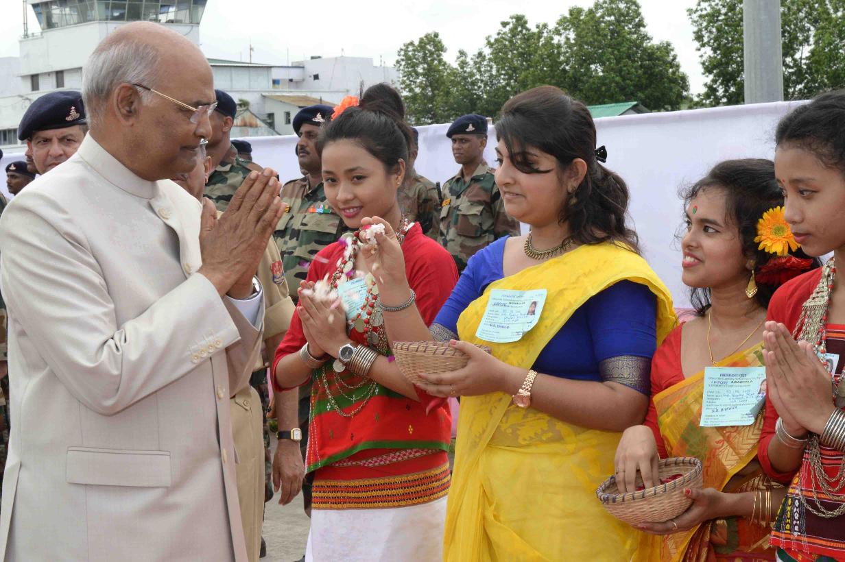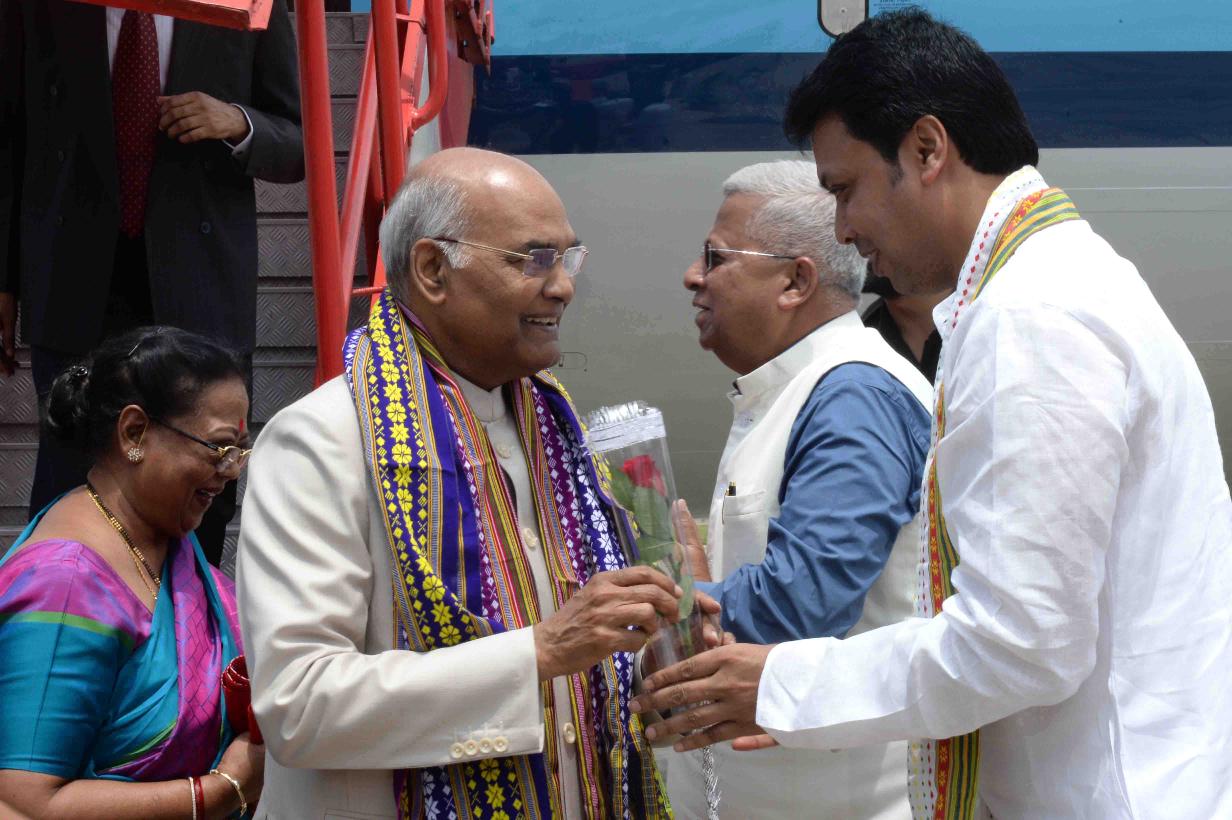 | Caption: | The President of India, Shri Ram Nath Kovind being received by the Governor of Tripura, Shri Tathagata Roy and the Chief Minister of Tripura, Shri Biplab Kumar Deb, at Agartala Airport, in Tripura on June 07, 2018. |