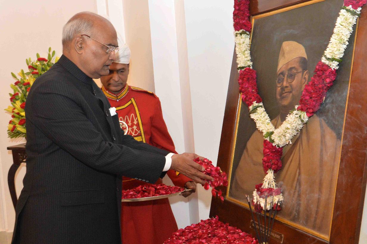 | Caption: | The President of India, Shri Ram Nath Kovind paying floral tributes at the portrait of Netaji Subhash Chandra Bose on the occasion of his Birth Anniversary, at Rashtrapati Bhavan on January 23, 2018. |