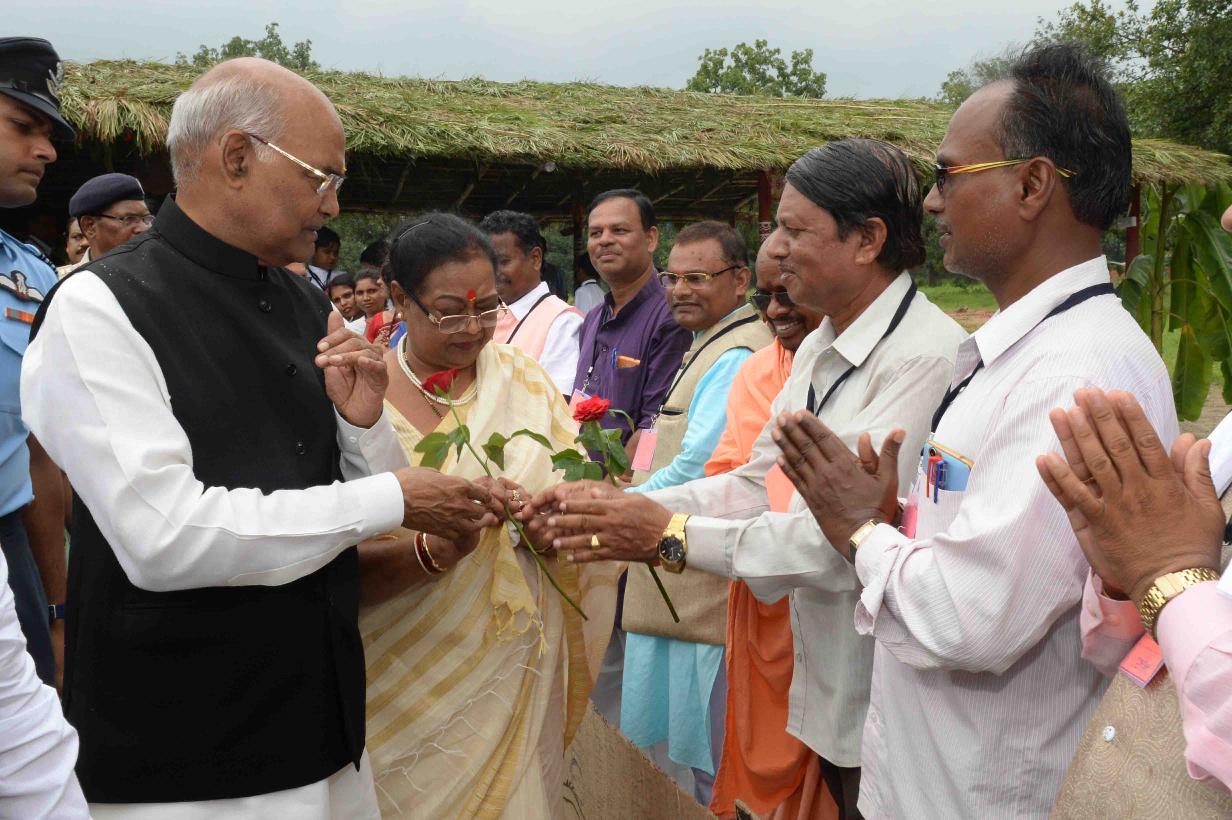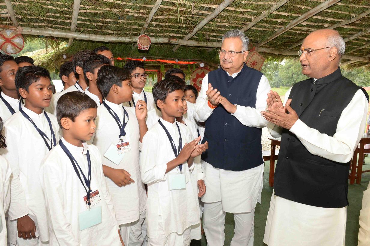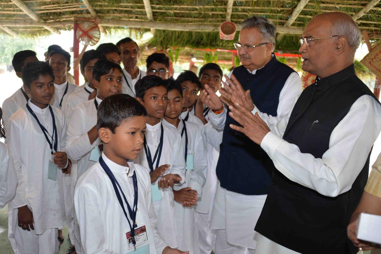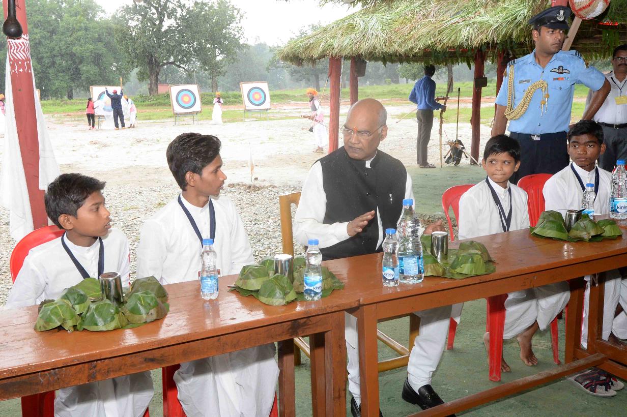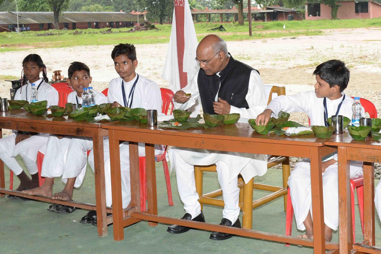| Caption: | The President of India, Shri Ram Nath Kovind during interaction and lunch with the students of Vanavasi Kalyan Ashram School, at Heeranar, Jagdalpur, in Chhattishgarh on July 25, 2018. |