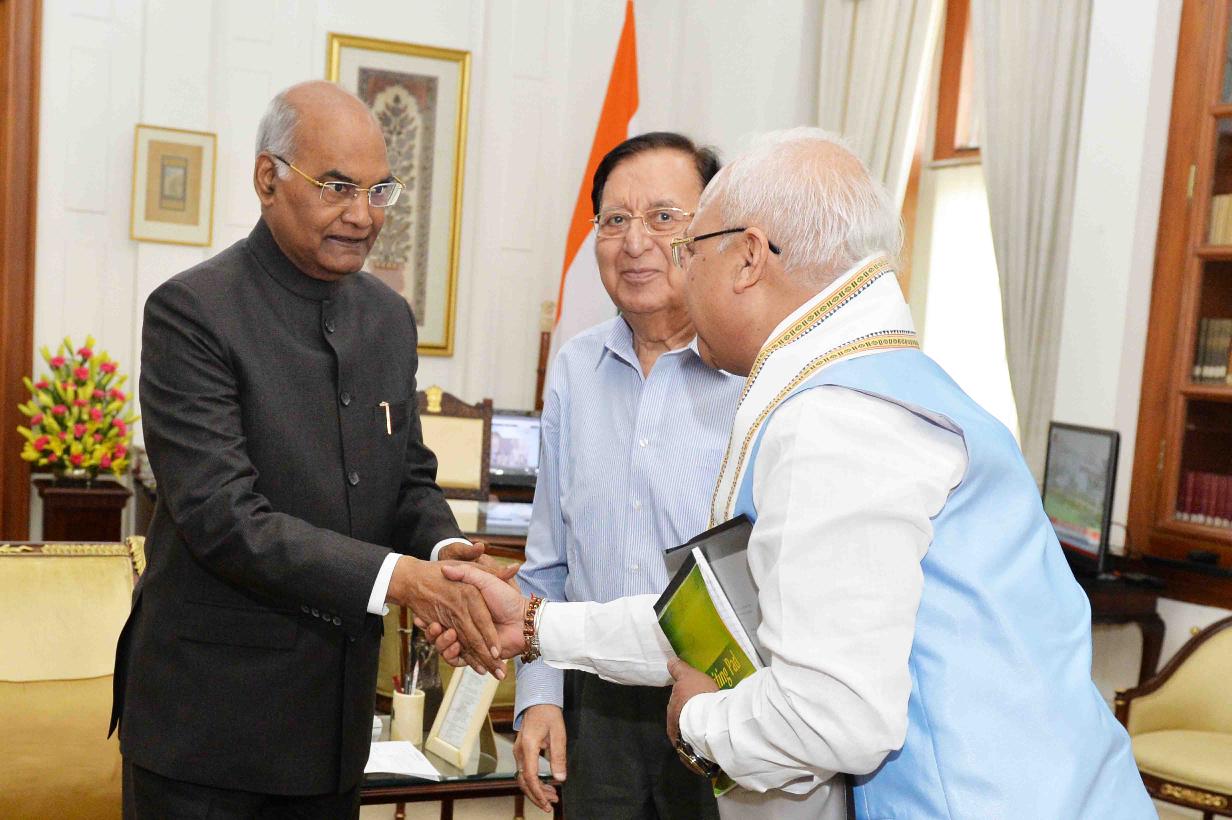 | Caption: | Dr. Hari Gautam, Chancellor and Prof. Ramesh Kumar Pandey, Vice Chancellor, Shri Lal Bahadur Shastri Rashtriya Sanskrit Vidyapeeth meeting with the President of India, Shri Ram Nath Kovind, at Rashtrapati Bhavan on April 20, 2018. |