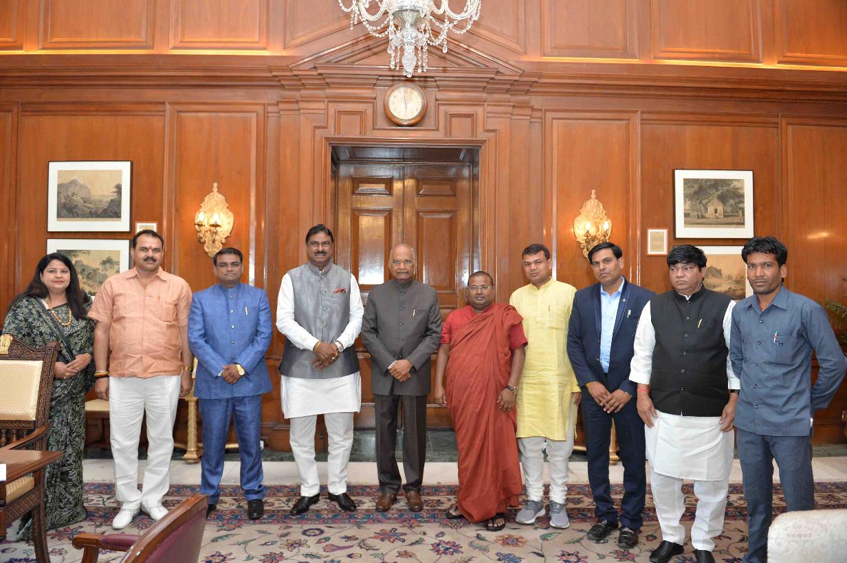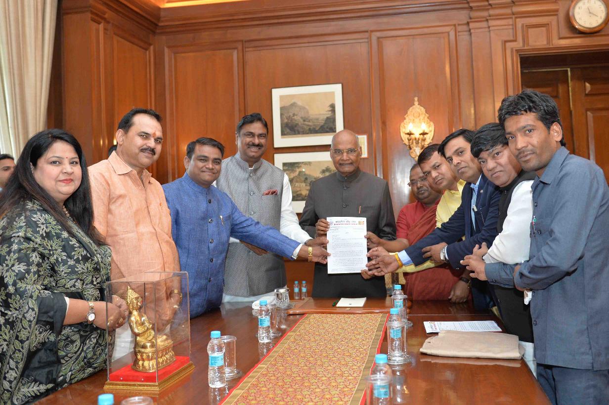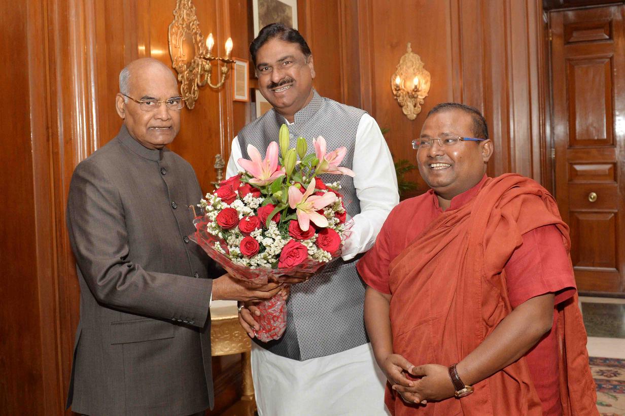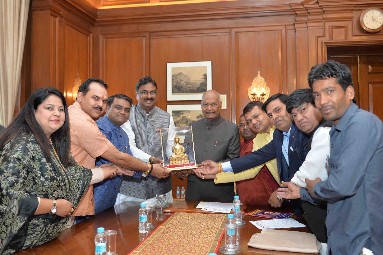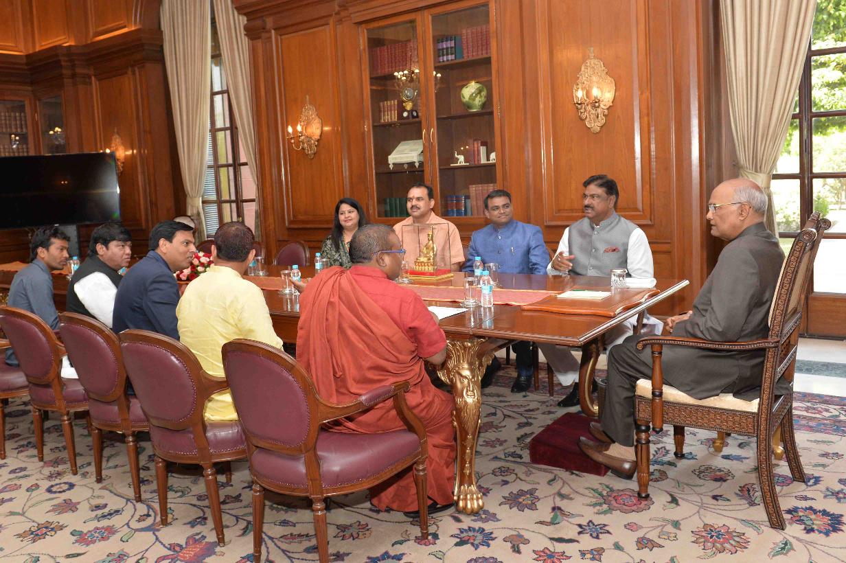 | Caption: | Bhante Sanghpriya Rahul, Rashtriya Adhyaksh, Bharatiya Baudh Sangh along with a delegation consisting of Shri Ashok Pradhan, former Union Minister, Shri Suresh Pasi, Minister of State in Uttar Pradesh Govt. and other office bearers of the Sangh meeting with the President of India, Shri Ram Nath Kovind, at Rashtrapati Bhavan on April 23, 2018. |
