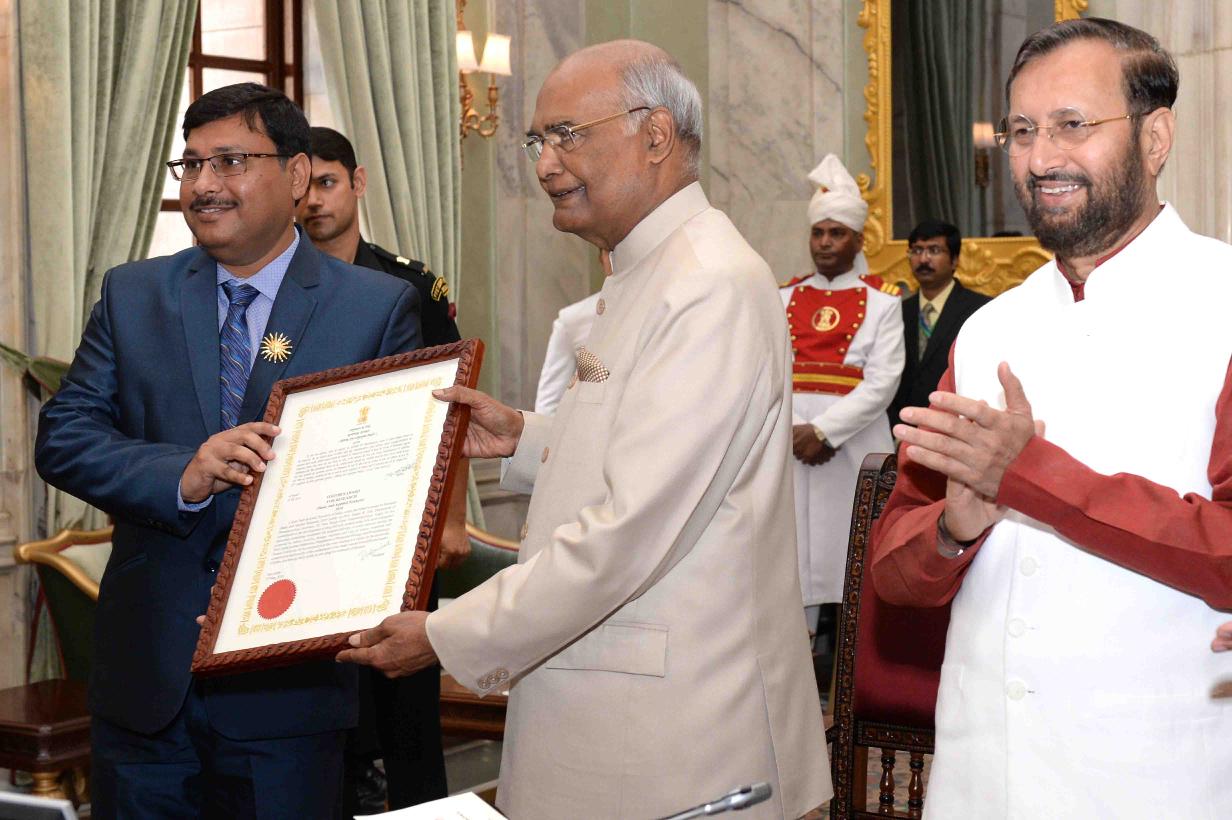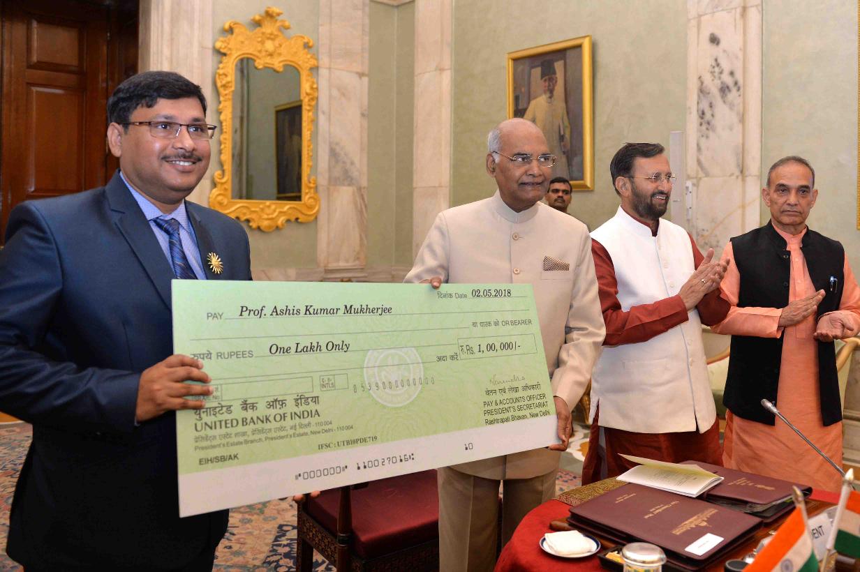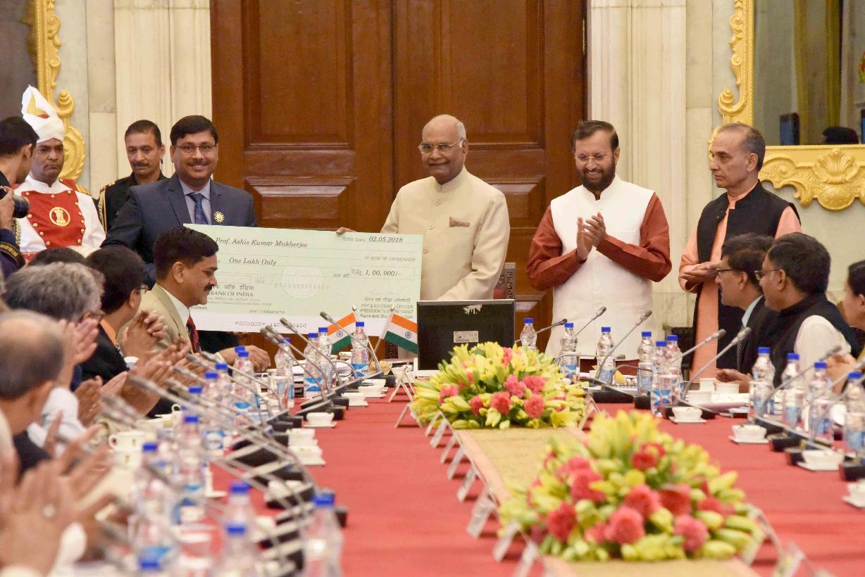 | Caption: | The President of India, Shri Ram Nath Kovind presenting the Visitor s Award to Prof. Ashis Kumar Mukherjee, Tezpur University, Assam for research in the field of Basic and Applied Science, during the meeting of Vice Chancellors of Central Universities, at Rashtrapati Bhavan on May 02, 2018. |
