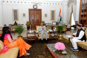 | Caption: | Shri Virender Kashyap, MP (LS) from Shimla, Himachal Pradesh along with Ms. Vimlesh Brijwall, Secretary, Megh Mandal Sansthan from Badmer, Rajasthan meeting with the President of India, Shri Ram Nath Kovind, at Rashtrapati Bhavan on August 09, 2018. |