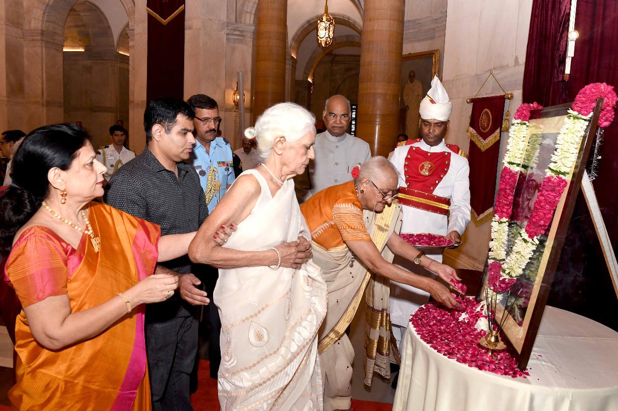 | Caption: | The President of India, Shri Ram Nath Kovind paying floral tributes at the portrait of the former President of India, Shri V.V. Giri on his Birth Anniversary, at Rashtrapati Bhavan on August 10, 2018. Family members of Shri V.V. Giri also paid tributes to him on the occasion. |