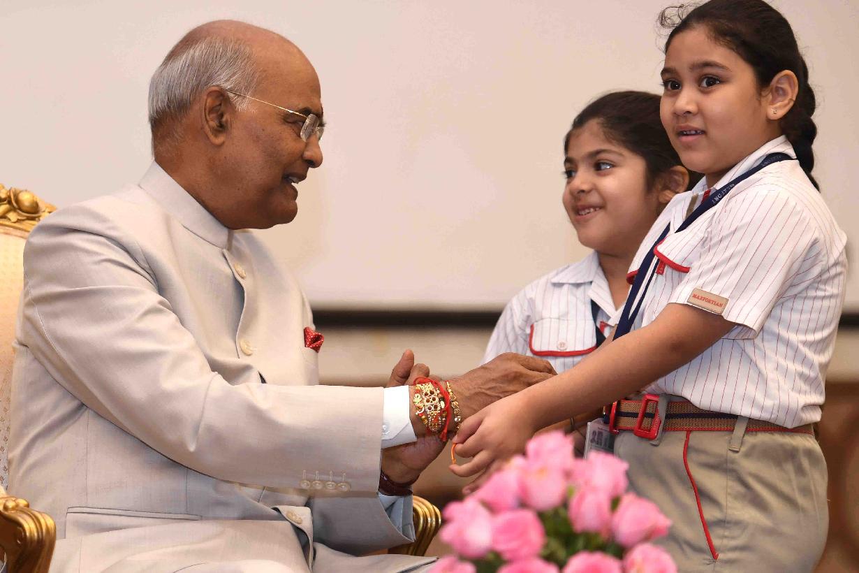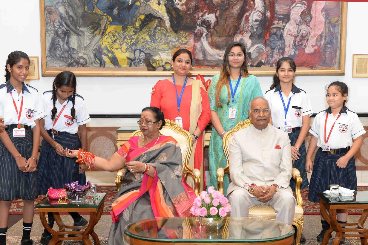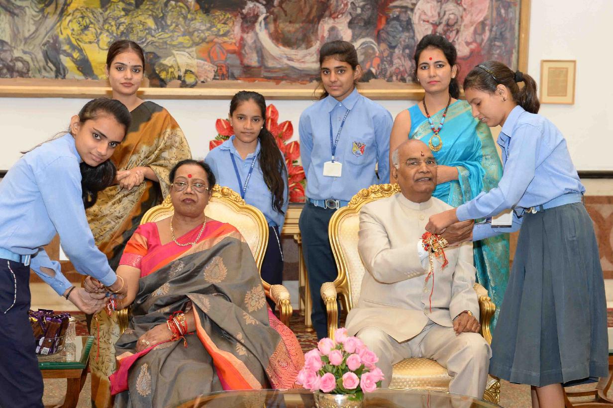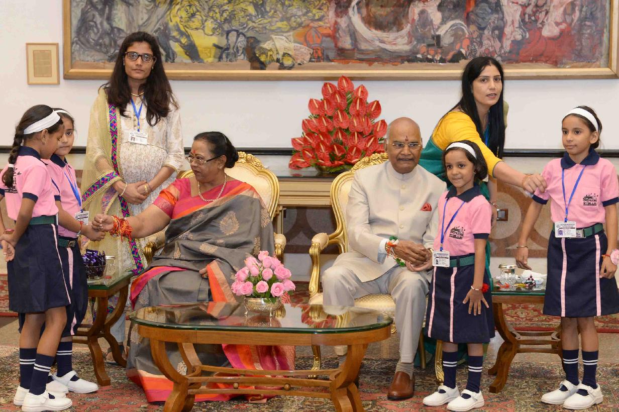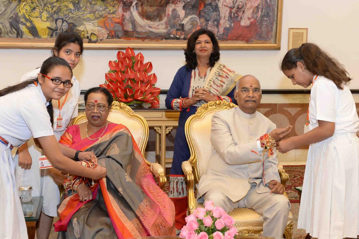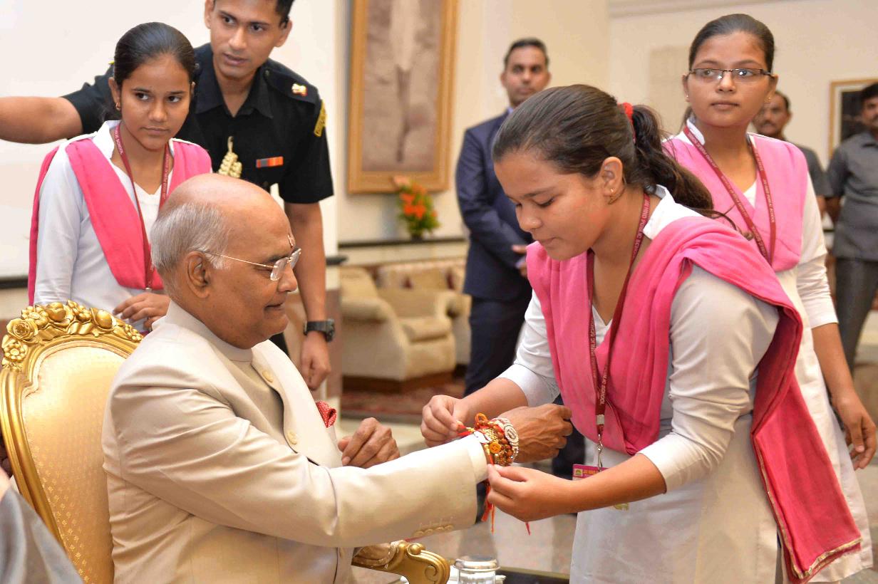 | Caption: | The President of India, Shri Ram Nath Kovind receiving Raksha Bandhan greetings from the students and children from various Schools and Organizations, at Rashtrapati Bhavan Cultural Centre on August 26, 2018. |