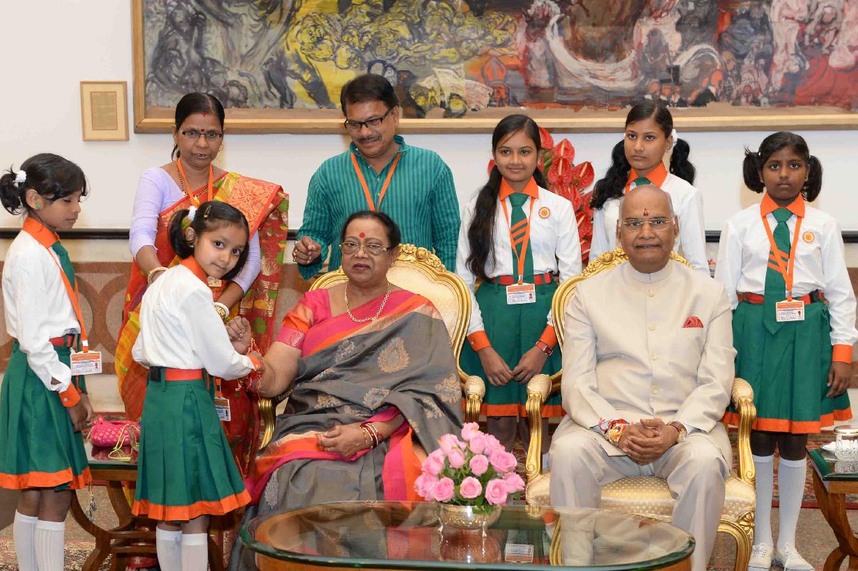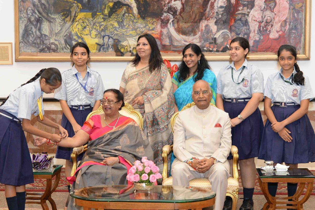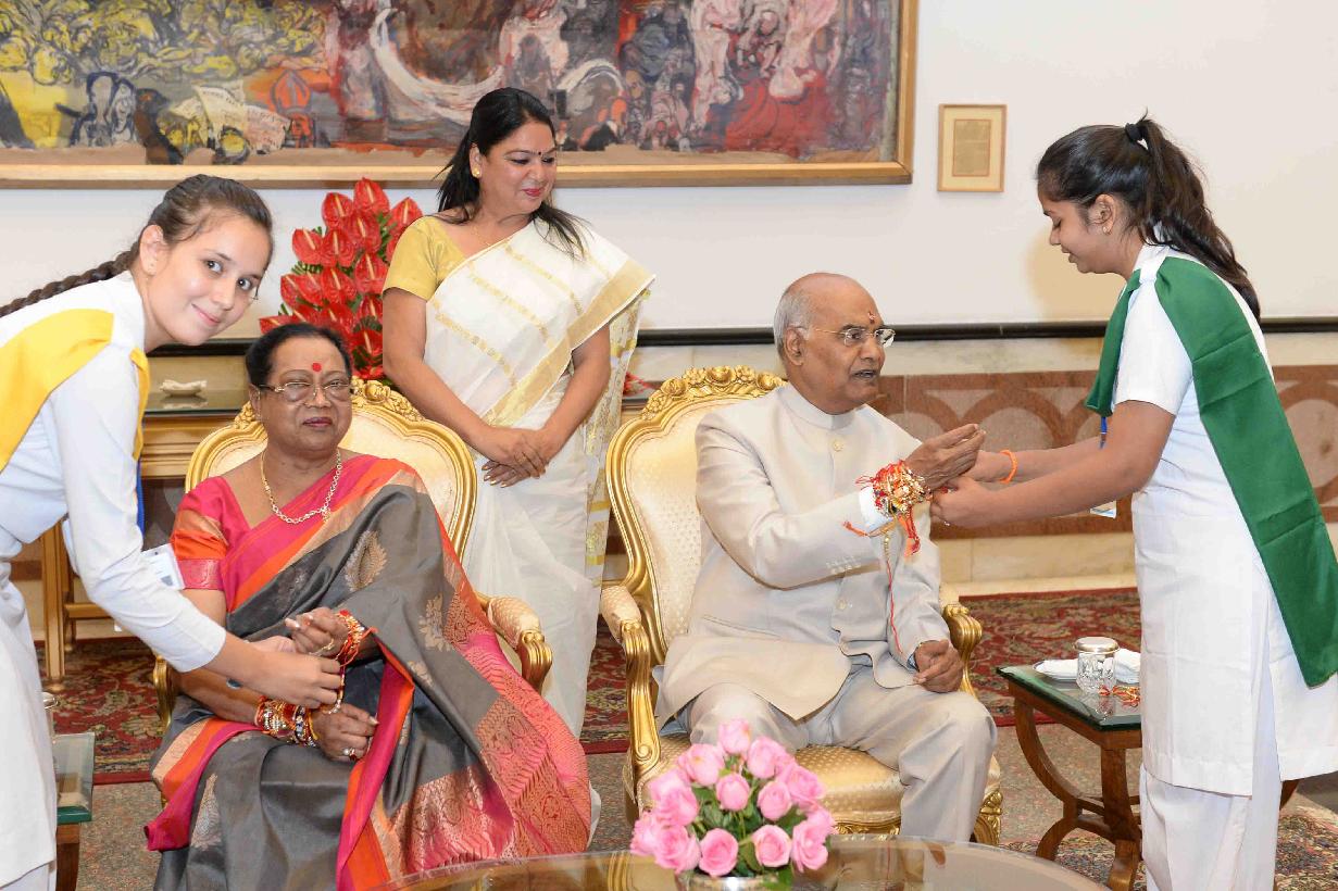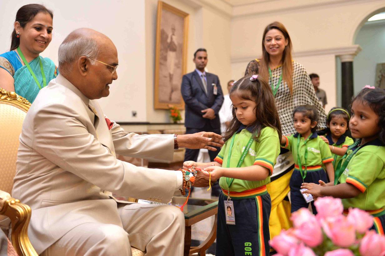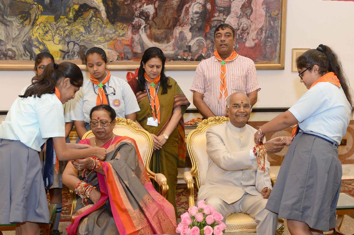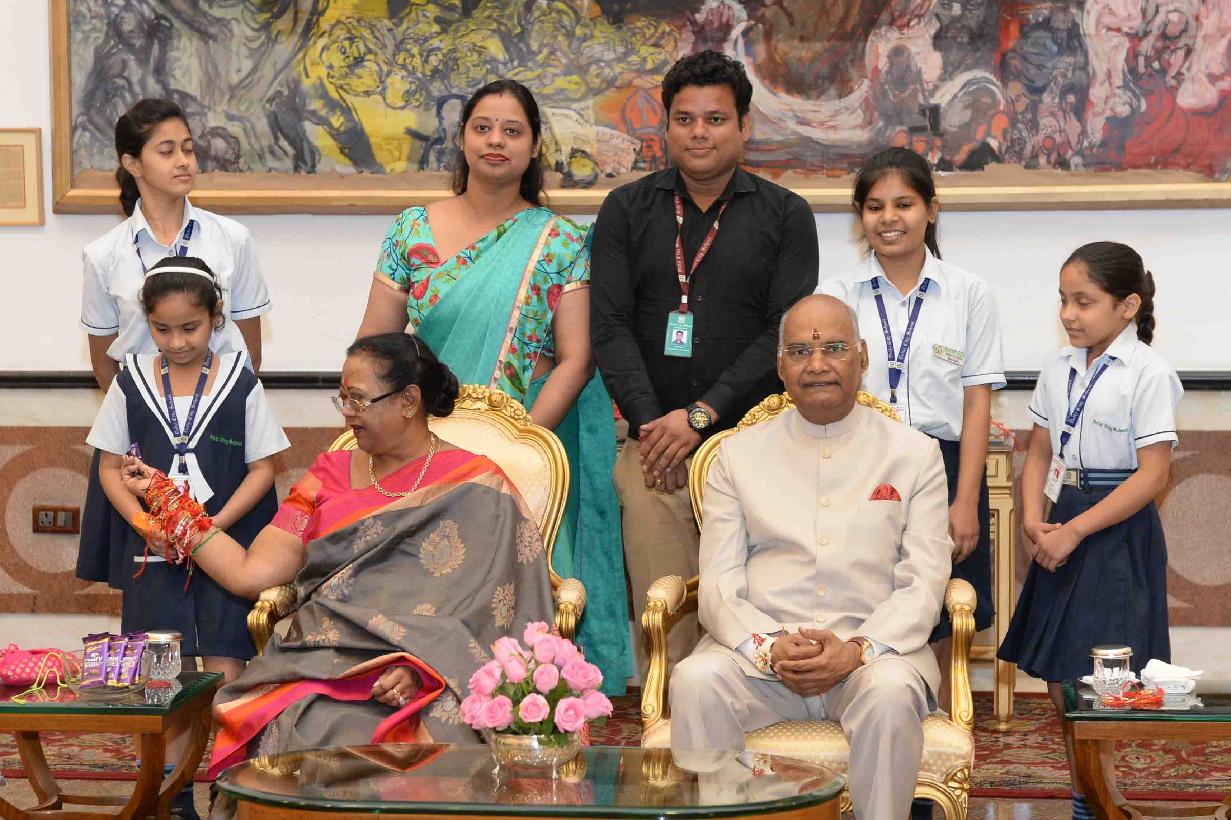 | Caption: | The President of India, Shri Ram Nath Kovind receiving Raksha Bandhan greetings from the students and children from various Schools and Organizations, at Rashtrapati Bhavan Cultural Centre on August 26, 2018. |