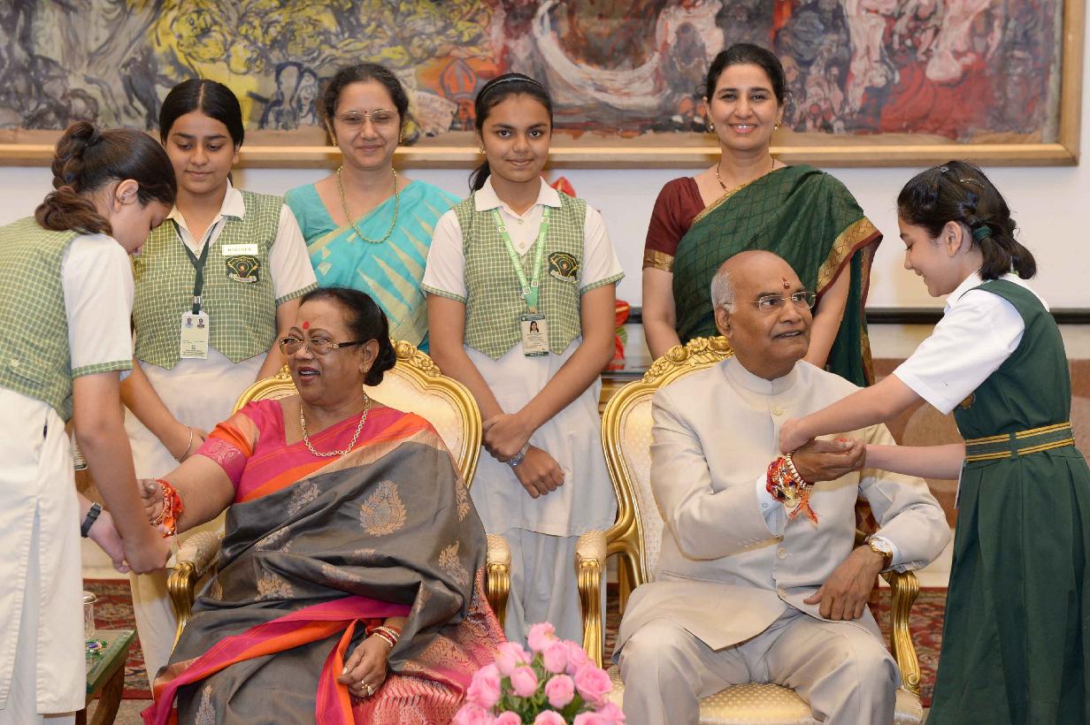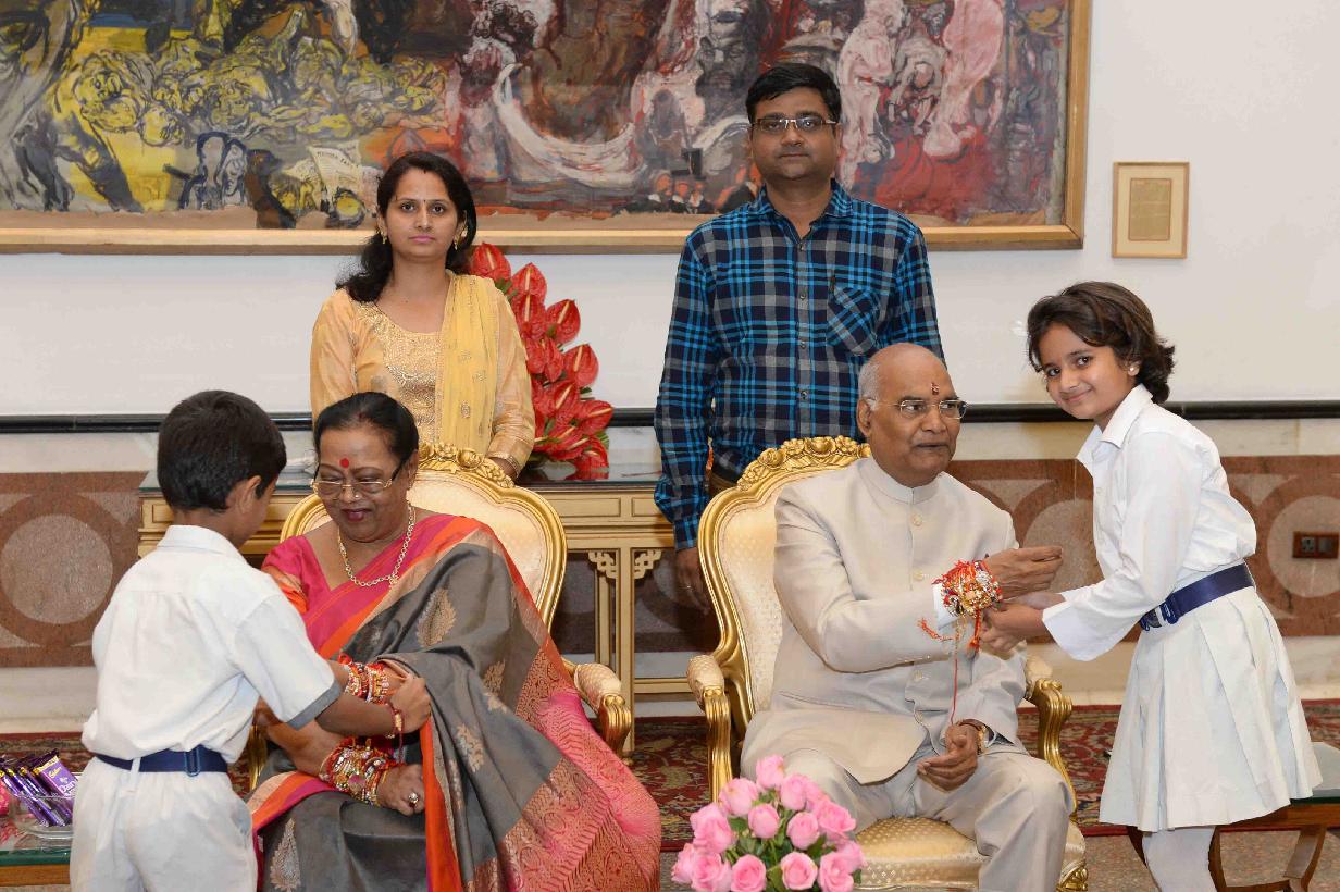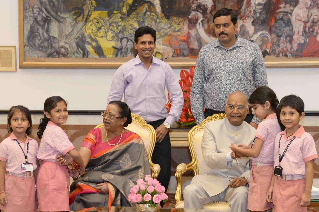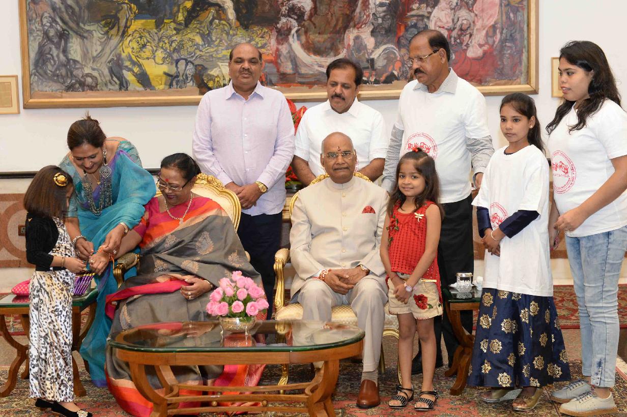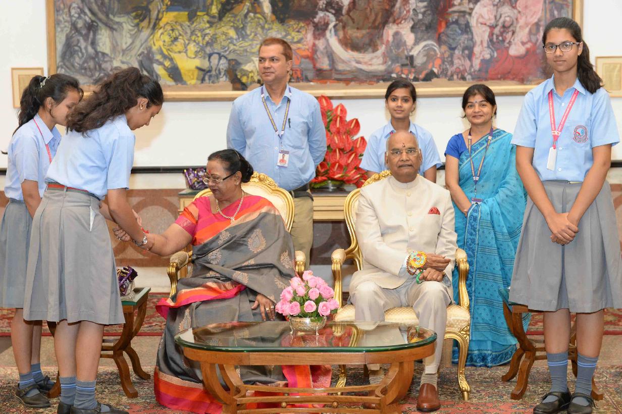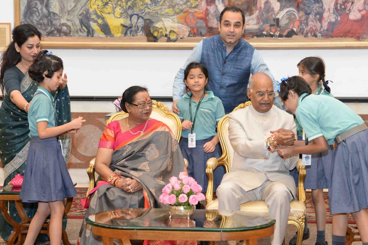 | Caption: | The President of India, Shri Ram Nath Kovind receiving Raksha Bandhan greetings from the students and children from various Schools and Organizations, at Rashtrapati Bhavan Cultural Centre on August 26, 2018. |