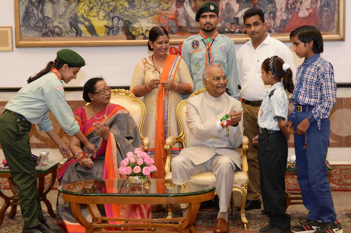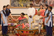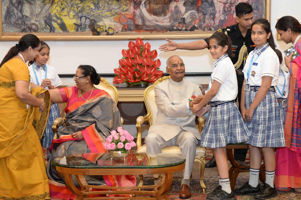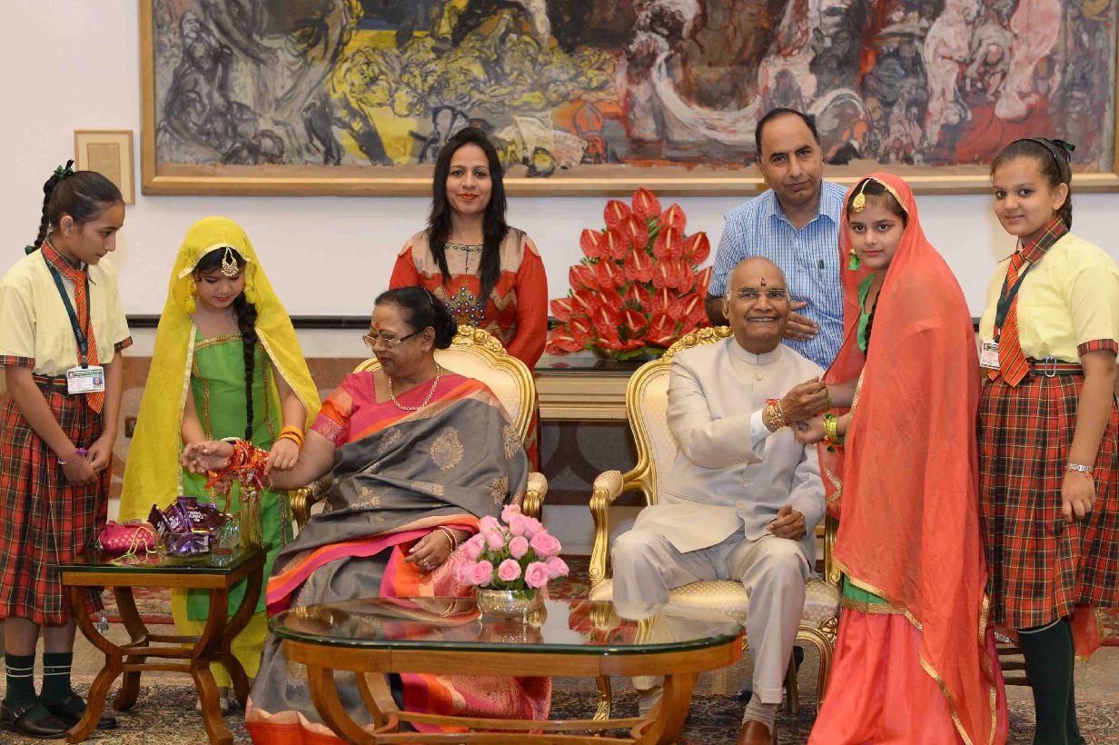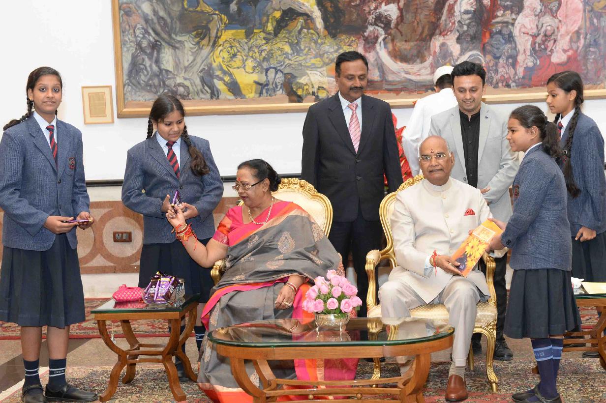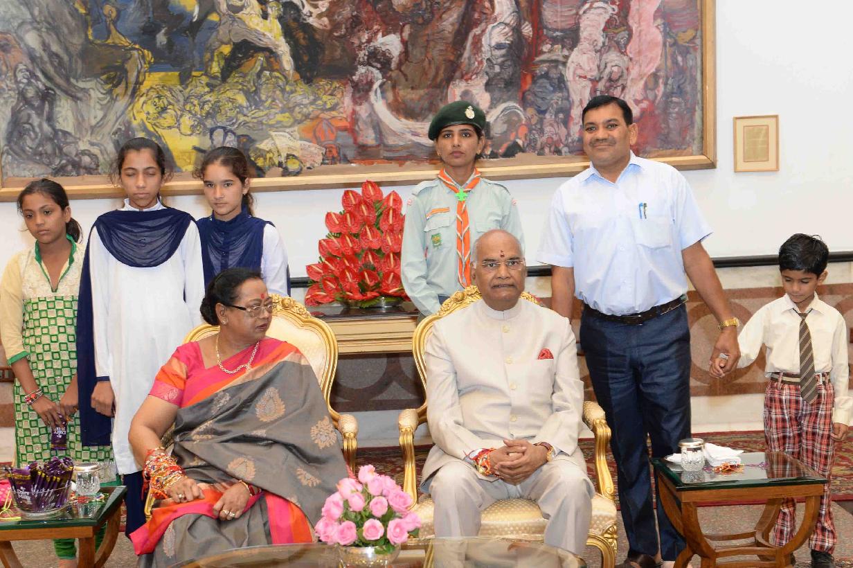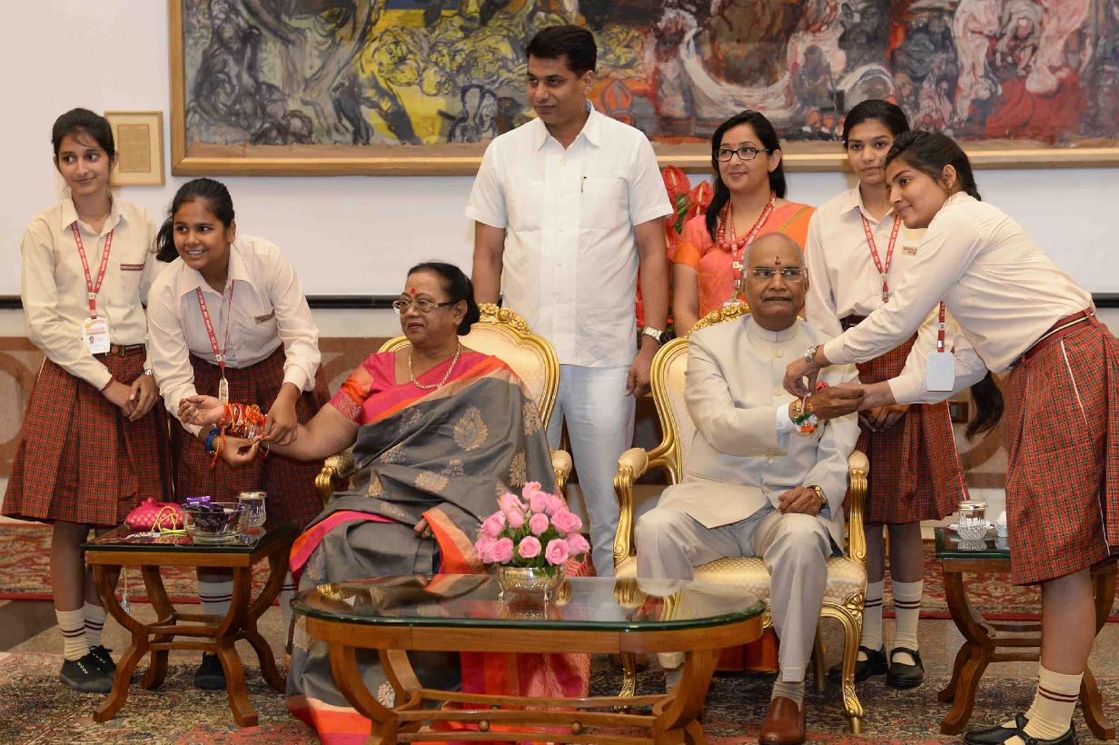 | Caption: | The President of India, Shri Ram Nath Kovind receiving Raksha Bandhan greetings from the students and children from various Schools and Organizations, at Rashtrapati Bhavan Cultural Centre on August 26, 2018. |