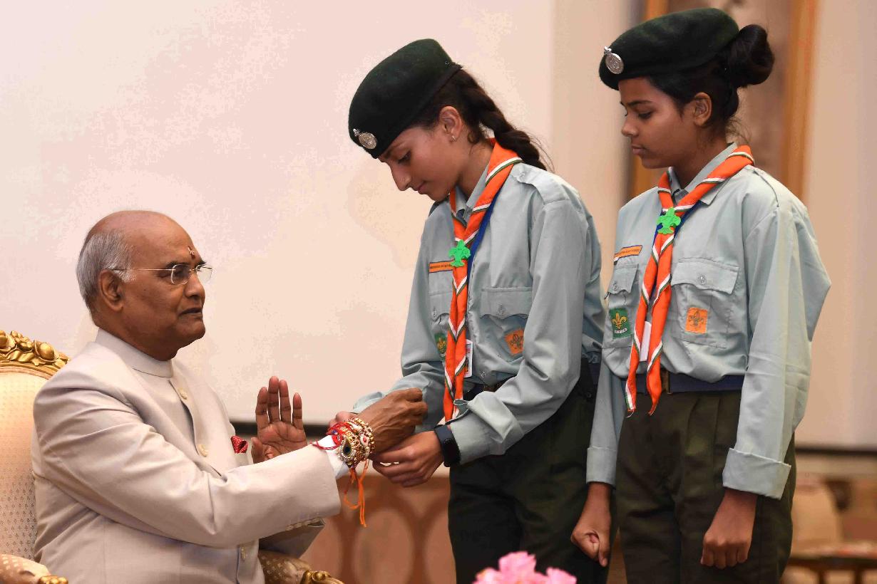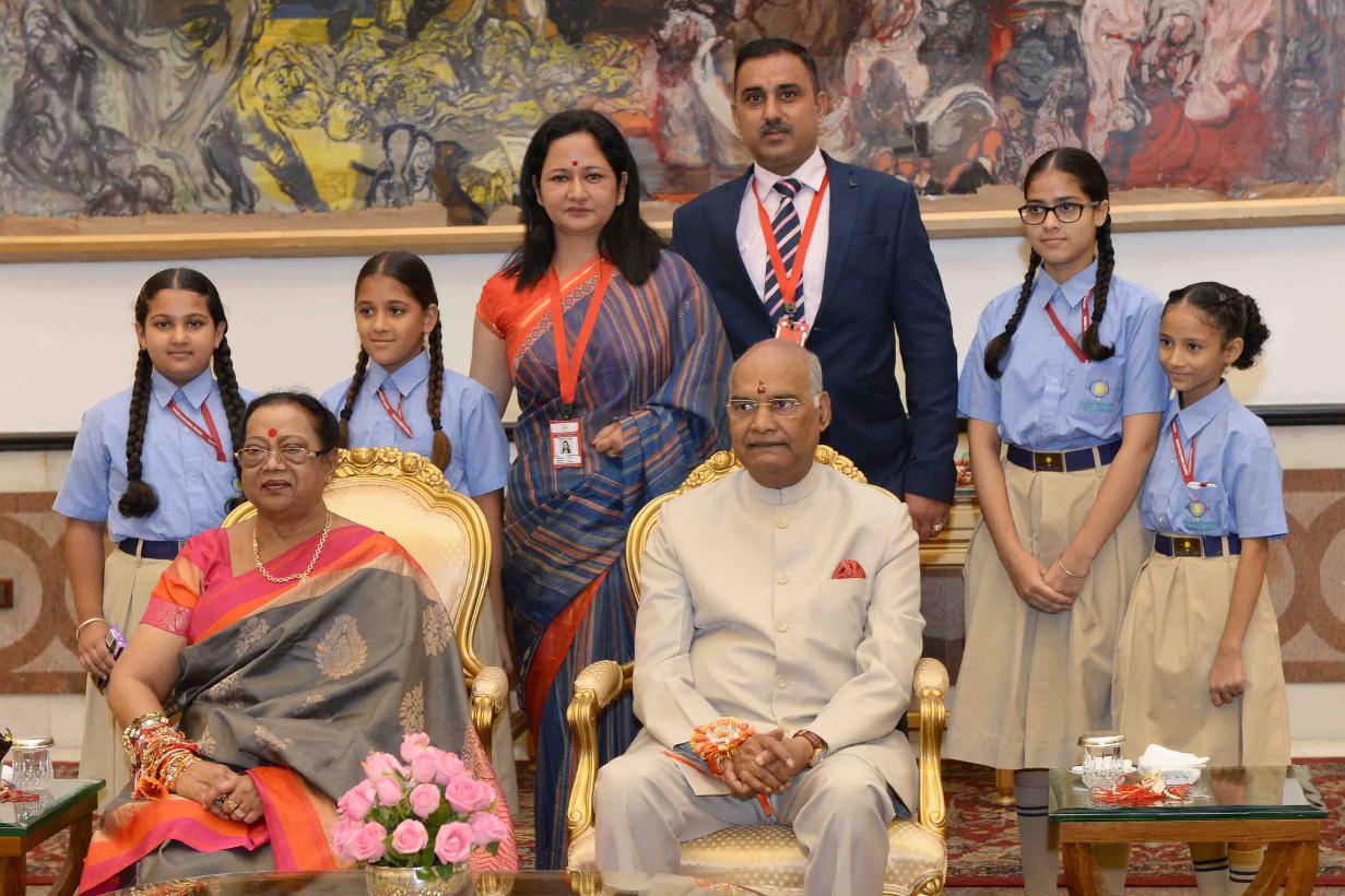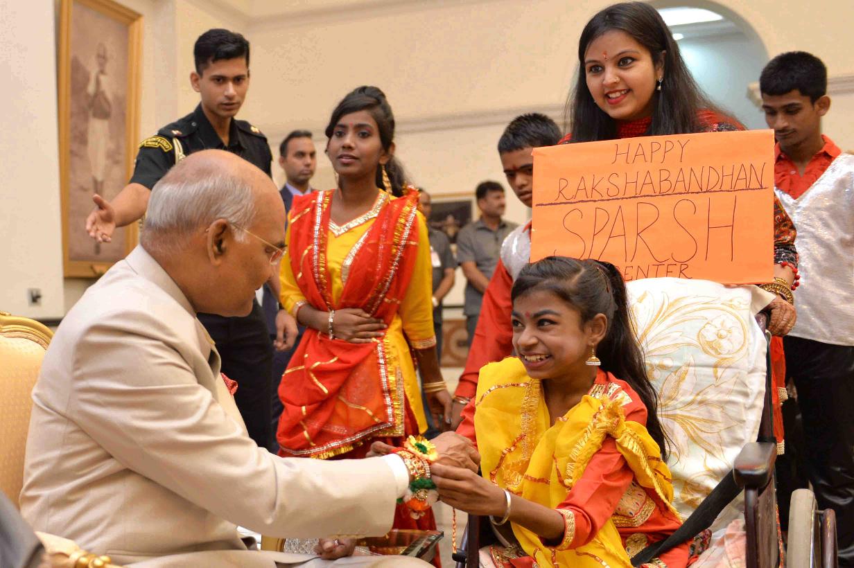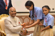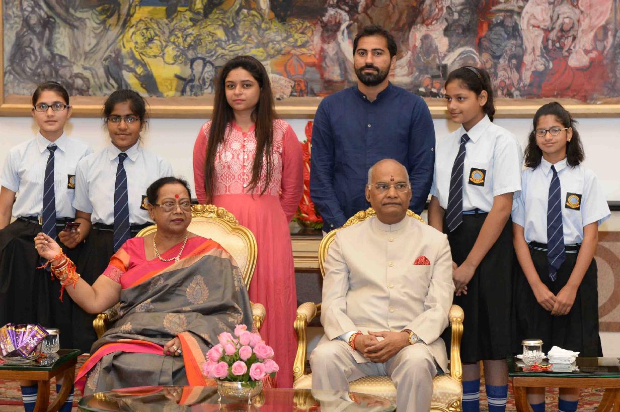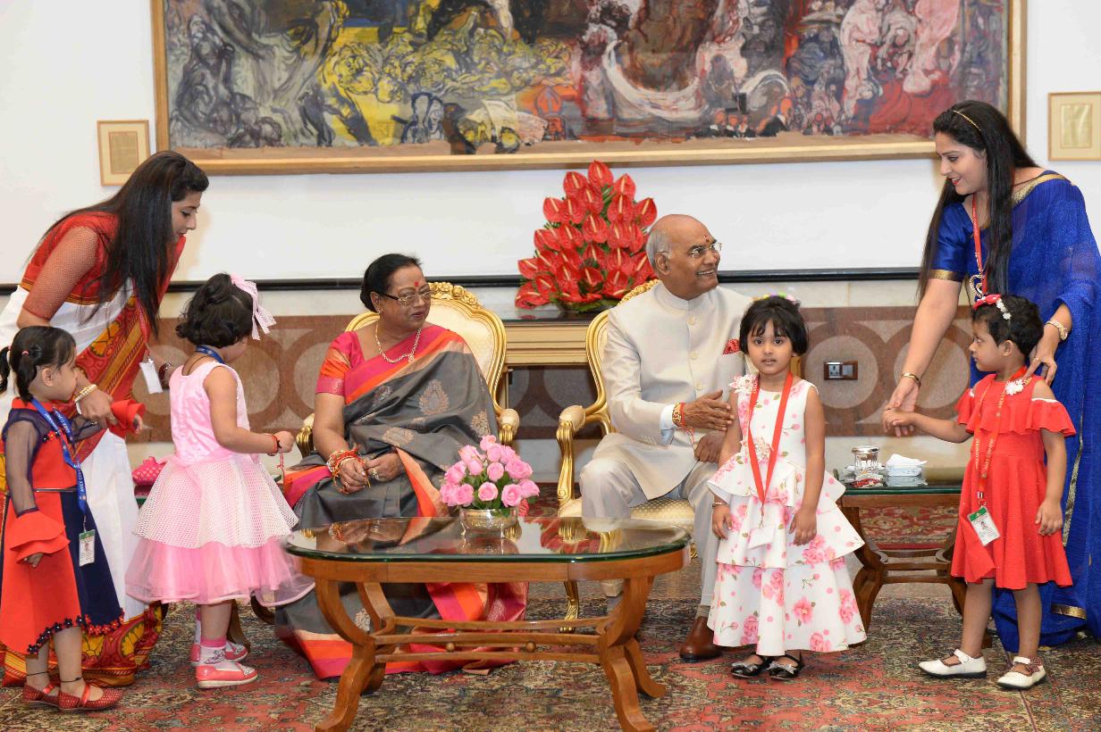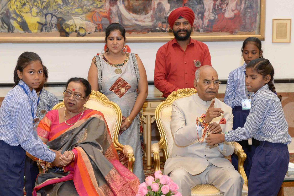 | Caption: | The President of India, Shri Ram Nath Kovind receiving Raksha Bandhan greetings from the students and children from various Schools and Organizations, at Rashtrapati Bhavan Cultural Centre on August 26, 2018. |