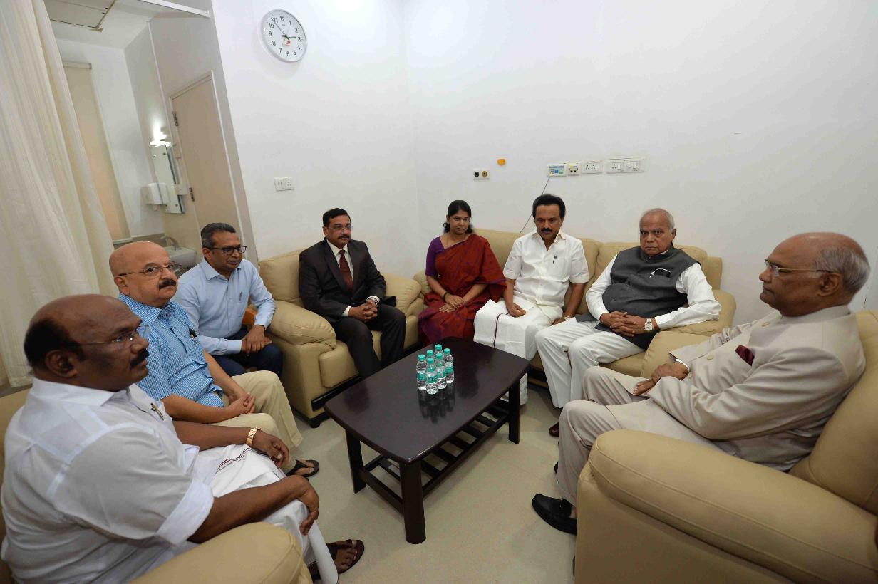 | Caption: | The President of India, Shri Ram Nath Kovind met Kalaignar s family members and doctors and inquired about his health, at Kauvery Hospital, Chennai on August 05, 2018. |