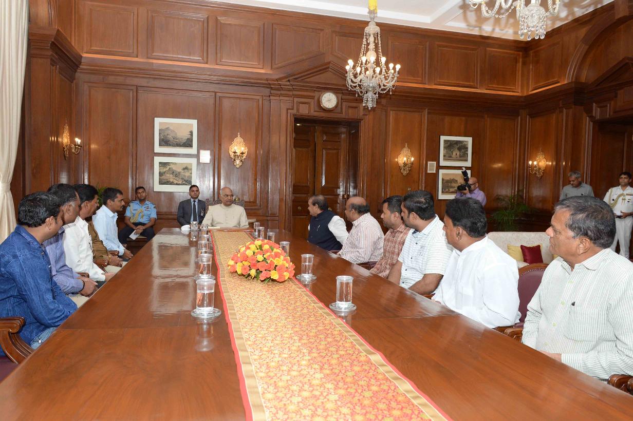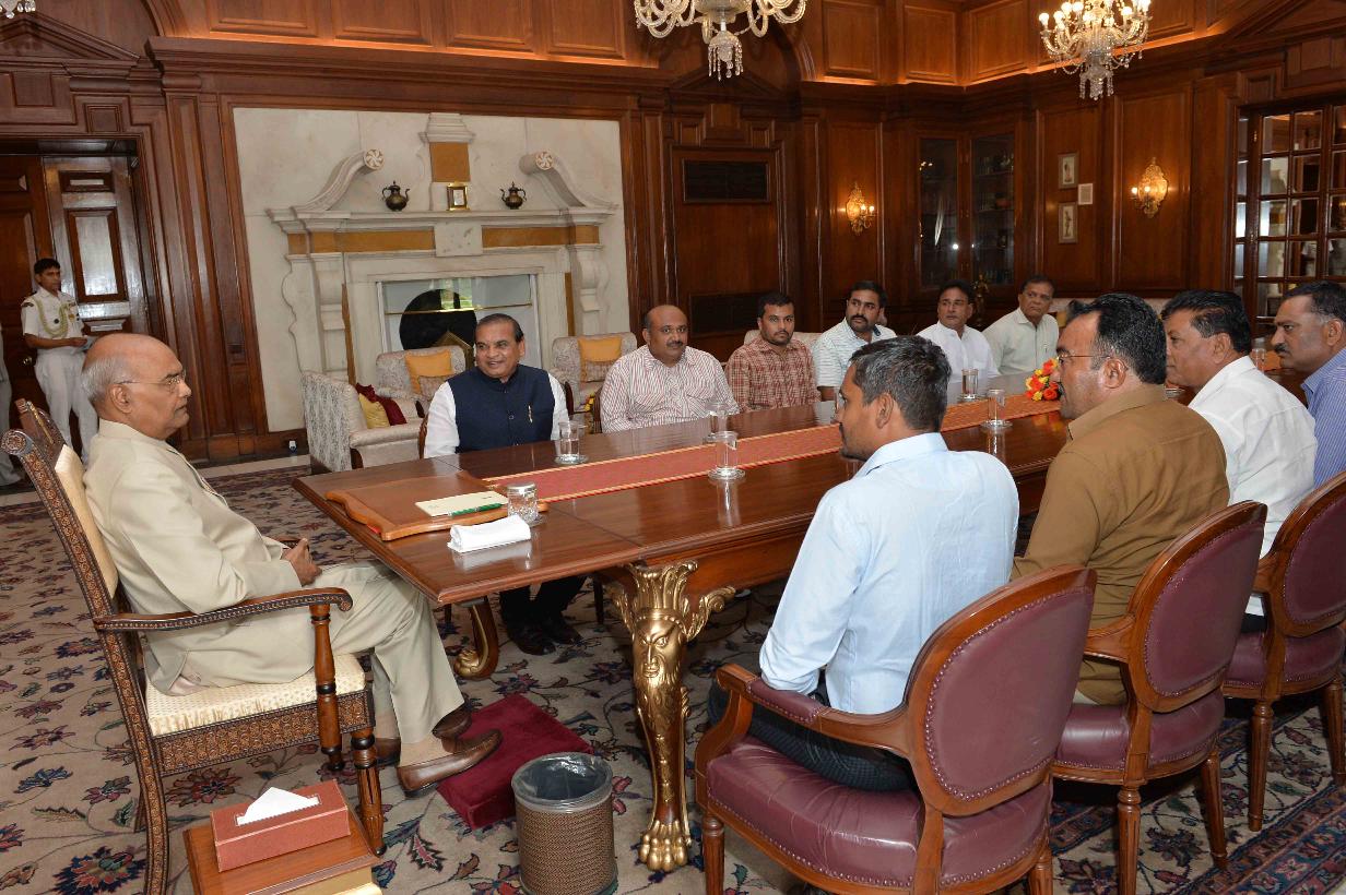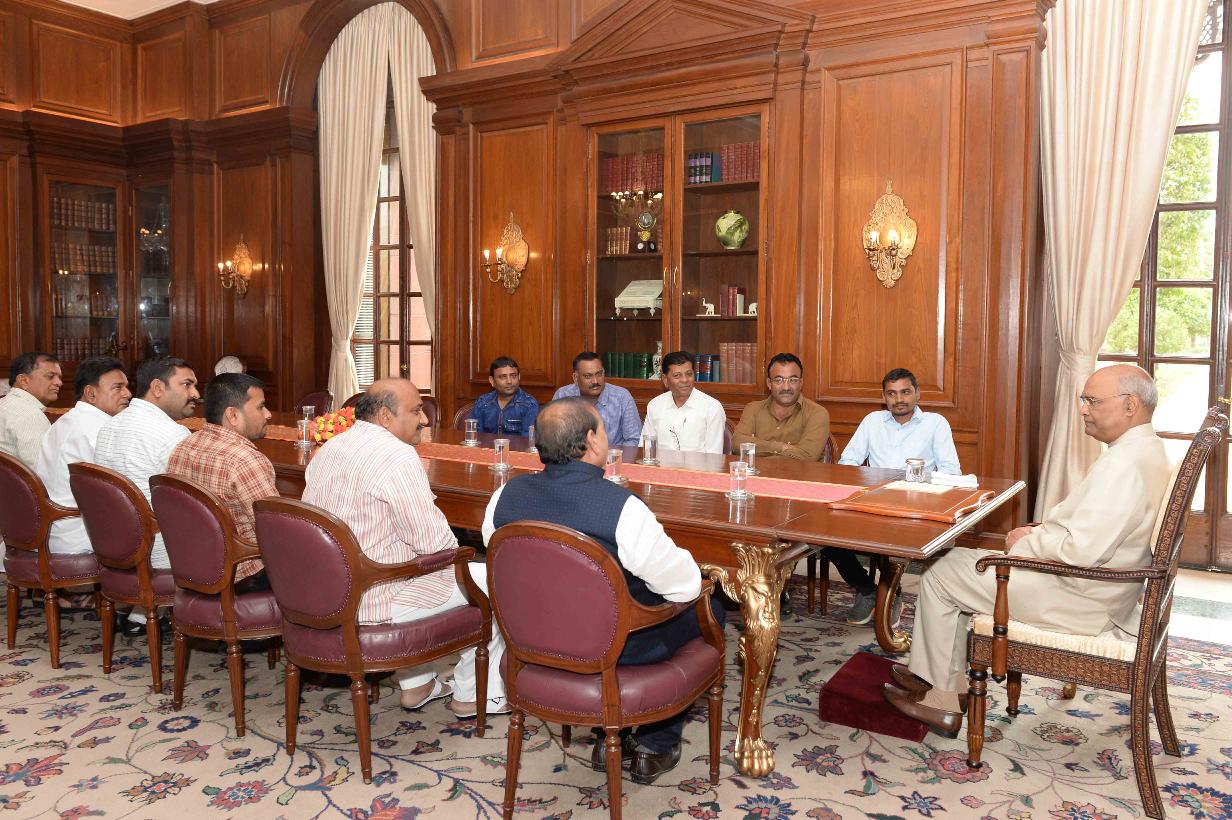 | Caption: | Shri Naranbhai Kachhadiya, MP (LS) alongwith a delegation of BJP officials & workers from Amreli, Gujarat meeting with the President of India, Shri Ram Nath Kovind, at Rashtrapati Bhavan on August 03, 2018. |