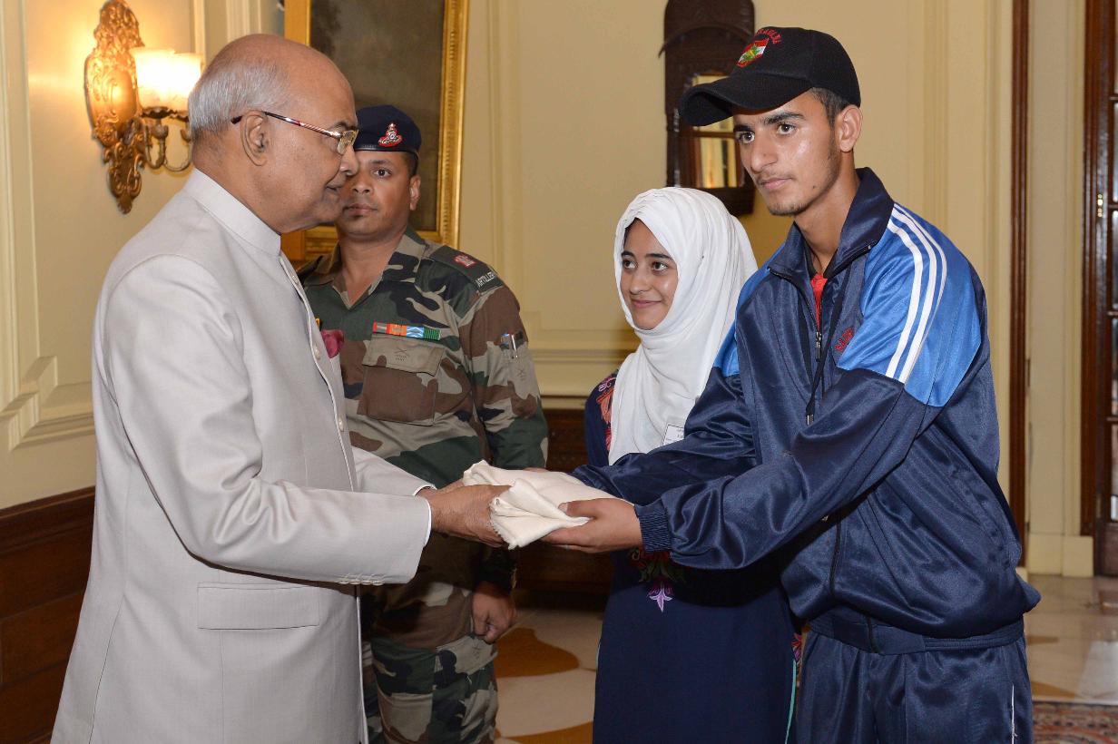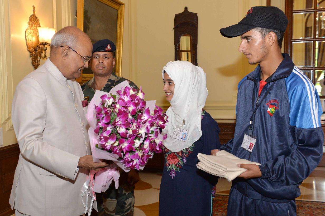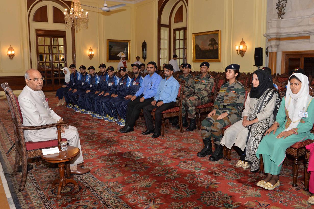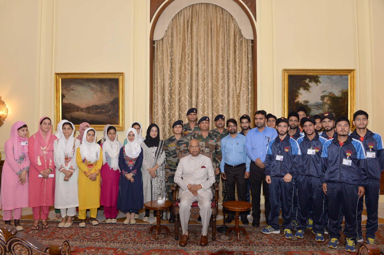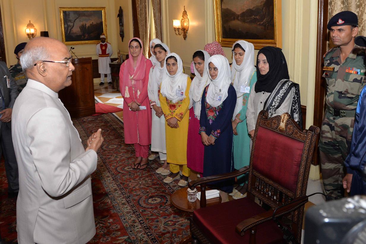 | Caption: | The President of India, Shri Ram Nath Kovind meeting with the college students from Gurez, Tangdhar and Kupwara of Jammu & Kashmir attending Capacity Building Tour, organised by 8 Fd Regt/HQ 15 Corps of Northern Command, at Rashtrapati Bhavan on September 01, 2018. |