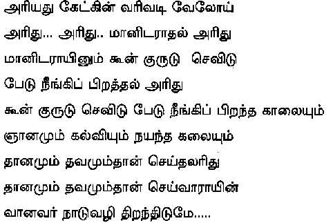 Whenever I see a physically or mentally challenged person, I start thinking that God has not completely perfected his creation. Sometimes he makes his image of the human being in different way, it may be his perfection. At this point I recall an apt event that highlights how blissful it is to be born as a man or a woman without any deformity. A great poet, Auvaiyar, who had been singing and singing, visiting all parts of Tamil Nadu, had composed a poem on how precious it is to be born as a perfect human being. First I will recite the poem in Tamil then I will give its meaning in English.